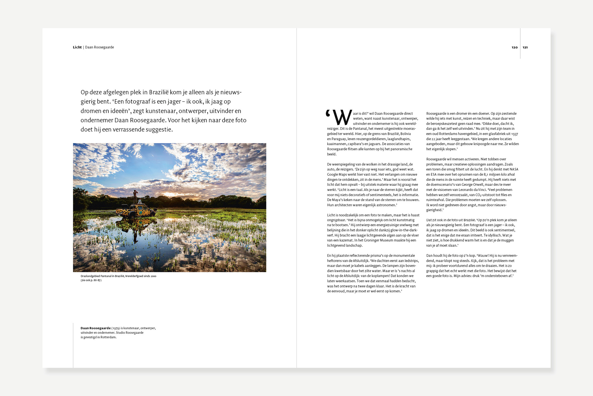 Dit omvangrijke overzichtsboek van fotograaf Raymond Rutting bevat de mooiste selectie uit zijn werk van de afgelopen twintig jaar. Het boek is opgedeeld in zes fotografische thema’s die worden uitgediept in interviews met Sacha de Boer (contrast), Jop Ubbens (diepte), Marieke van Schaik (perspectief), Govert Schilling (ruimte), Gerdi Verbeet (tijd) en Daan Roosegaarde (licht). De zes delen openen steeds met een karakteristiek beeld bij het onderwerp, waarop groot de titel staat. De daaropvolgende spread laat een fotokeuze zien van de geïnterviewde, die aan het eind van elk deel een toelichting op zijn of haar keuze geeft. Het boek bevat foto’s van over de hele wereld, gemaakt voor o.a. De Volkskrant en National Geographic.